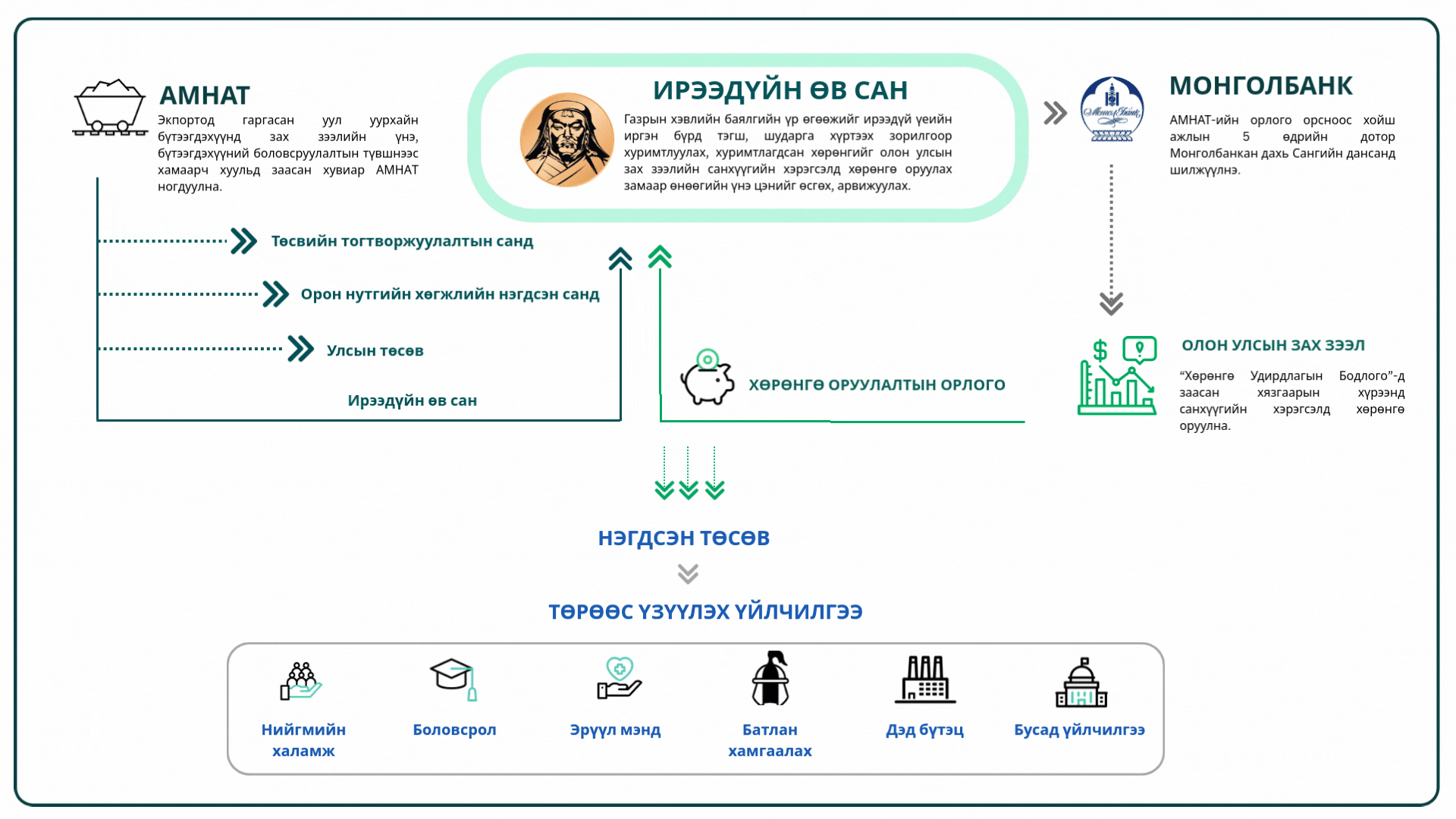 Ирээдүйн өв сан нь газрын хэвлийн баялгийн үр өгөөжийг ирээдүй үеийн иргэн бүрт тэгш, шударгаар хүртээх зорилгоор хуримтлуулж, олон улсын санхүүгийн зах зээлд хөрөнгө оруулж үнэ цэнийг нэмэгдүүлэх, арвижуулах үүрэгтэй сан юм. Энэхүү сан нь өнөөгийн болон ирээдүйн Монгол Улсын иргэдэд чиглэсэн урт хугацааны санхүүгийн баталгаа болох юм.
